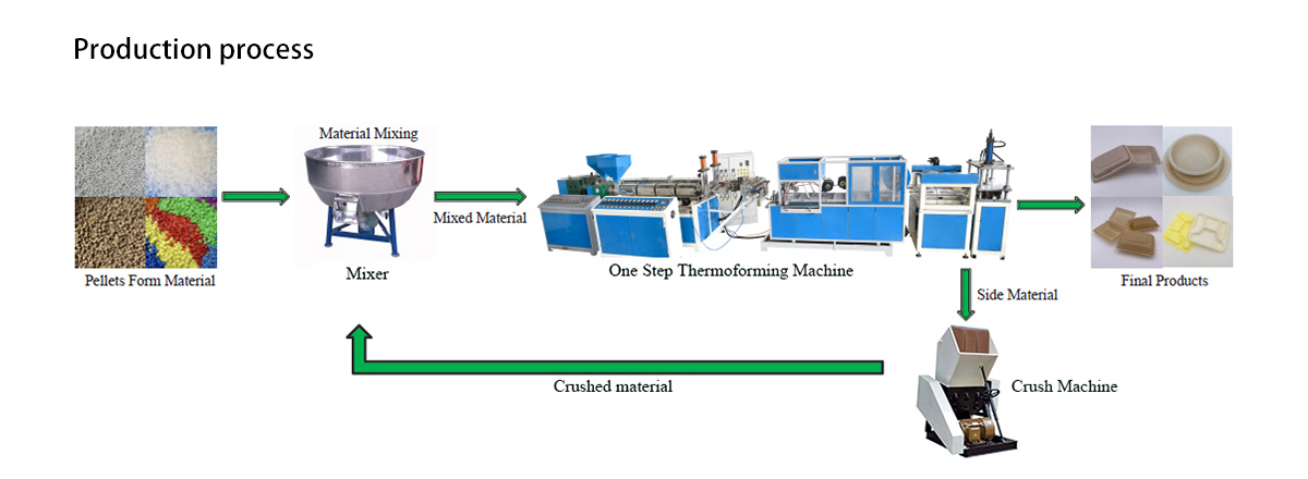 The machine includes an extruder, thermoforming and cutting parts. It uses raw materials such as polypropylene, calcium carbonate, talc, polylactic acid, orange straw, corn starch, wood flour, bamboo flour and other plant fibers to produce degradable cups, lunch boxes , dinner plates, plates, fast food boxes, packaging boxes, supermarket trays, biscuit boxes and other disposable products, scraps can be recycled and produced.