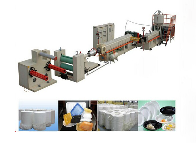 PS/PSP(Polystyrene) Foam Sheet Machinery adopts Gentian type double-stage series high foam technology. The raw material is general polystyrene granule. In the extruding process, vesicant is injected at high pressure. After extruding, foaming, cooling, shaping and hauling off, it is winding to finished PS foam sheet rolls. After vacuum forming system, the finished PS foaming sheet can be made into variety of packaging container such as fast food box, aquatic plate, supermarket tray, cake tray, KT board, instant noodle bowl, foam tray etc. It is widely used in the packing of food, fruit, advertising, industrial products and so on. This equipment adopts high speed non-stop hydraulic filter changer and PLC controller, it is easy for operation.